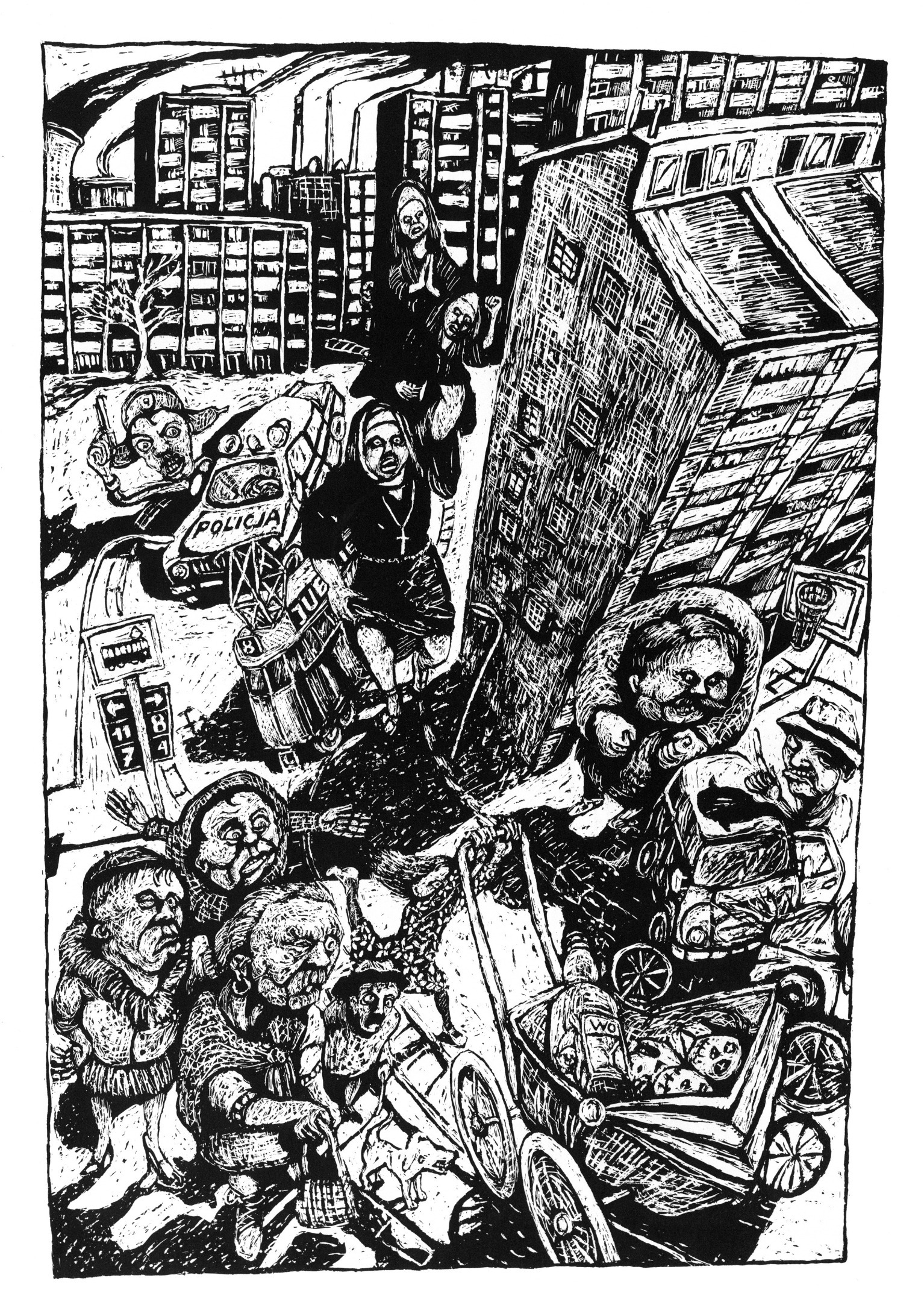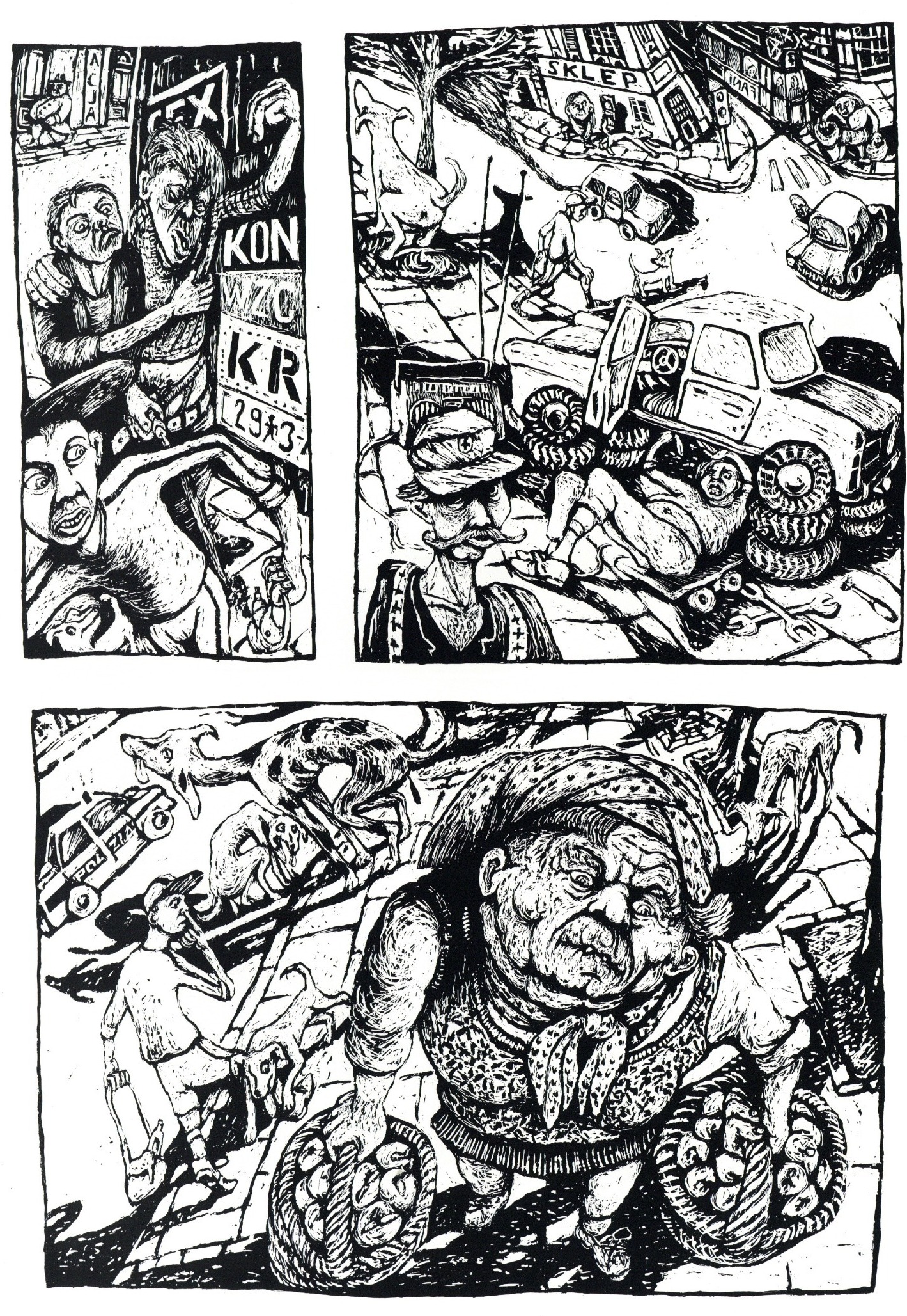 Mitten in einem Krakauer Hinterhof steht ein kleines Haus. Claudius Gentinetta verbringt hier dreizehn Monate als Stipendiant. Seine Alltagseindrücke sind geprägt durch die Sicht aus dem Fenster in den Hof, auf eine uralte Klostermauer, auf eine grüne Oase für Kinder, auf Hundeklos, Autoreparateure und deren bierselige Feste. Gentinetta, kein Wort polnisch sprechend, ist stummer Beobachter, dem Hände, Füsse und bald auch der Bleistift die Zunge ersetzen müssen. Der Zeichner befindet sich schnell einmal inmitten von kuriosen Geschichten, die sich auf den Strassen, im Hinterhof und in seinem Kopf abspielen. Expressiv und ohne einschränkende Erklärung durch Worte zeigen Gentinettas Comics Menschen, Orte und Geschehnisse.